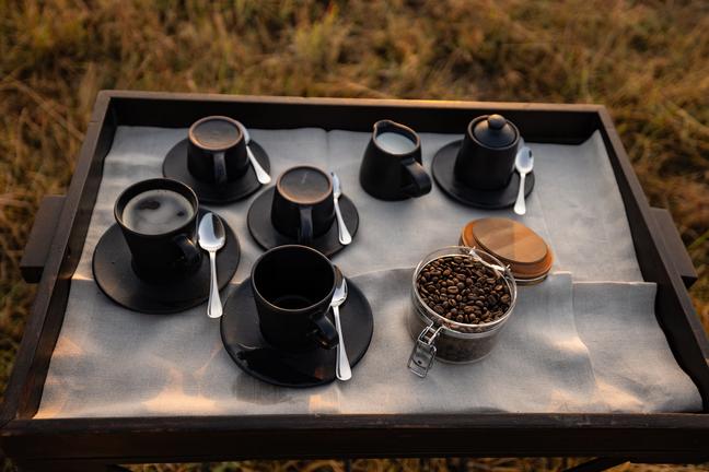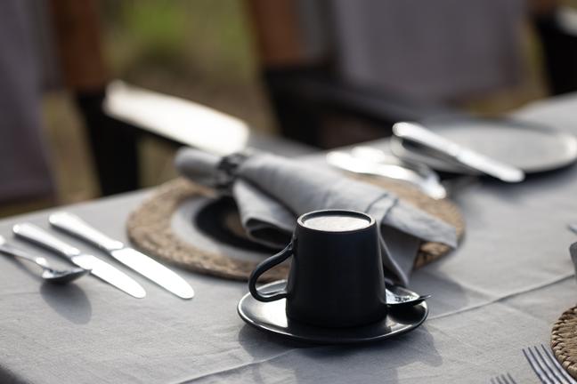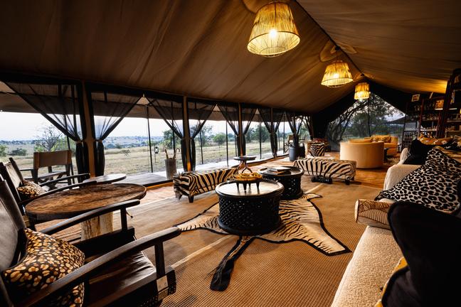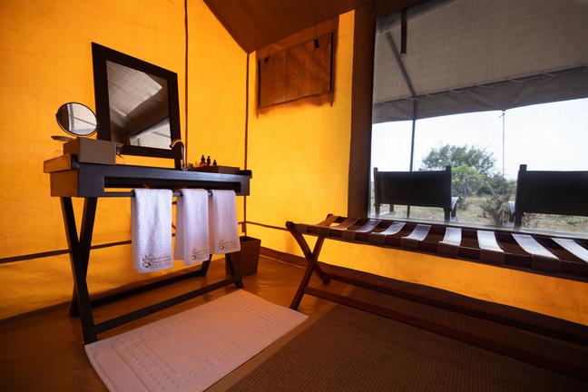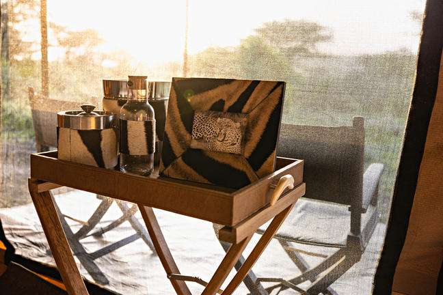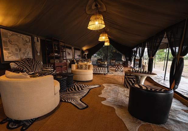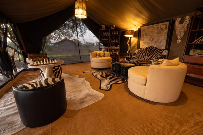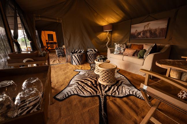 • The Lounge and Bar tents, the shared lounge and bar tent features stunning interior pieces reflecting the golden sunset of the African bush. Charcoal grey, saffron, Dijon and granite colors compliment the Sabi Forest moonlight print. The African furniture collection compliments the lounge but also very comfortable. • Separate dinning tent • Air condition – None • Coffee station - available in each tent