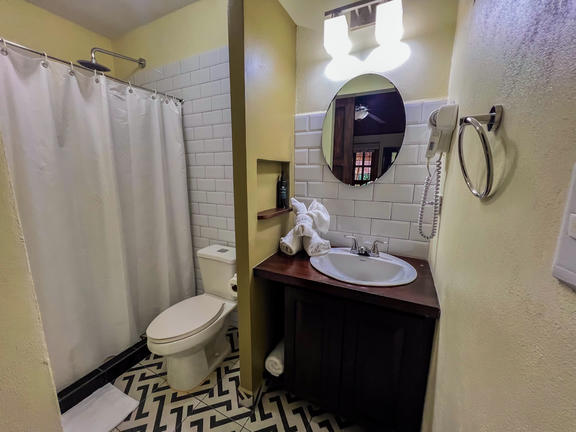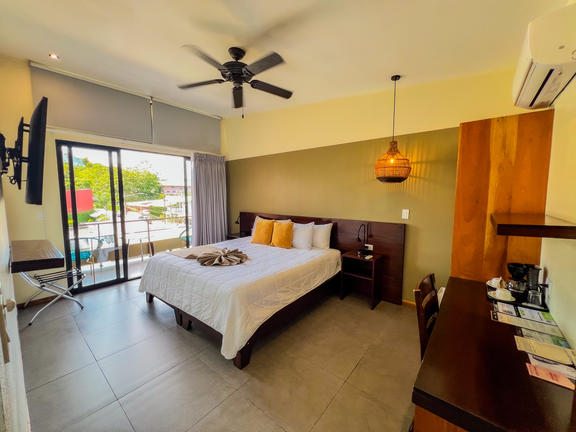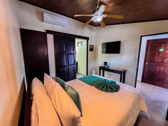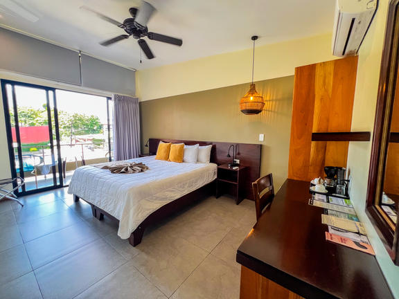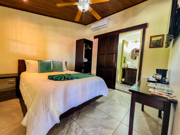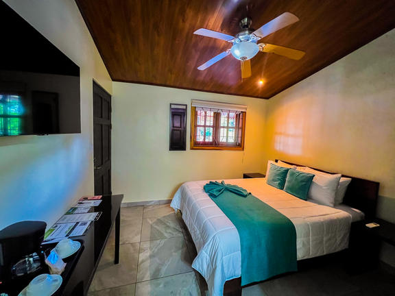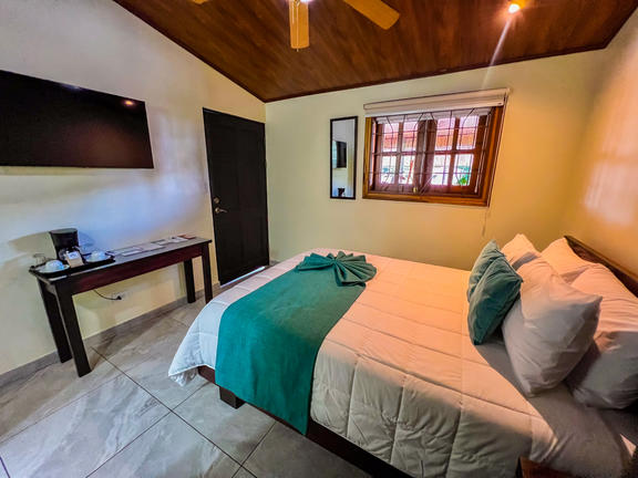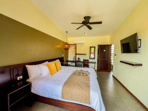 Bungalow King rooms are standalone cabins with a King size bed. Cabins are very private, have solar hot water, private bathrooms, private porch, ceiling fans and upgraded amenities. Agouti has an excellent ocean view and is a wooden cabin with a semi-outdoor bathroom. Jaguarundi is a tiled cabin, large room and partial ocean views, with an enclosed bathroom.