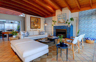 3/4 twin beds, en-suite bathroom with shower and bath, separate lounge with fire-place, kitchen and stunning sea view from living room balcony. Stair access on