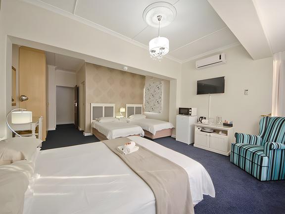 The Standard Family room sleeps 2 adults and 2 children. with twin beds and a sleeper couch. This comfortable room has air conditioning, a flat screen TV with satellite channels, a desk, tea and coffee making facilities and a mini refrigerator. There is a en-suite bathroom with shower. Rooms with double beds are available on request. Breakfast is served in the Palm Terrace Restaurant daily. Cots are available on request.