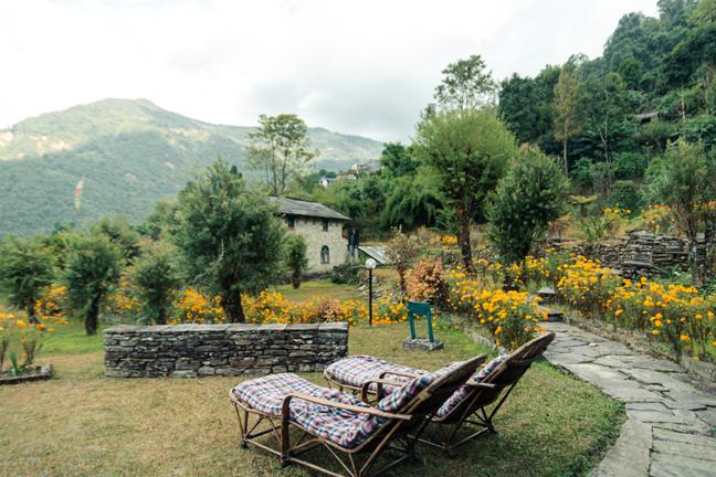 Majgaon Lodge, nestled in Nepal’s Annapurna region near Majhgaon village, offers stunning valley and mountain views. The lodge features well-decorated guest rooms with high ceilings, arched windows, and modern black-slate ensuite bathrooms. Dining is a convivial affair in the main room, where hearty international cuisine is served by a roaring fire, often followed by lively Nepalese music performed by guides. Additional offers include a library, happy hour service, yoga spaces, and inviting outdoor loungers perfect for watching sunsets over Fishtail Mountain.