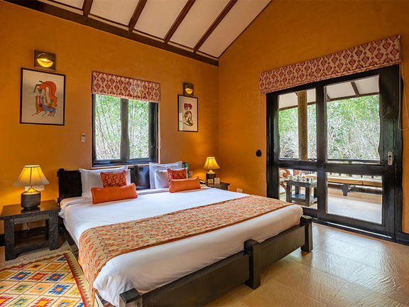 Kings Lodge is an eco-luxury wildlife resort located in the heart of Bandhavgarh National Park, Madhya Pradesh. Nearby attractions include the famed tiger safaris in Tala, Magadhi and Khitauli zones, as well as cycling and walking trails through the forested estate. Guest cottages feature air-conditioning, plush double beds, a private verandah, a writing desk, and bathrooms with organic toiletries. Guests enjoy farm-to-table dining with locally sourced produce, prepared fresh in the lodge’s kitchen. Facilities include guided jeep safaris, nature walks with expert naturalists, cycling tours, and sustainable practices that make it a tranquil retreat amidst pristine wilderness.