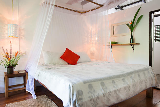 Cardamom is a double classic room accessed directly from the living room of the main house and has a king size double bed. The large room has space for an additional single bed or cot. Double patio doors open up into a small foyer and then out on to the side of the front terrace. For families looking for a cost effective solution and happy to share a bathroom, the Palm room (twin bed with no bathroom) can be booked in conjunction with Cardamom and securely interconnects through the private lobby. The two rooms form the Classic family rooms. Palm has twin single beds and is perfect for children who want the privacy of their own room but will share the bathroom in the Cardamom room. Palm can also be configured as a private air-conditioned sitting room for couples looking for a little more private space. and want to be close to the living and dining rooms. Occasionally Cardamom may be booked as a classic room when the other classic rooms are booked.