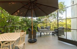 Open room, housing a master bedroom, with an upper mezzanine deck that can accommodate two. Walk-in shower with double wash basins, along with a separate bathroom with a bath with bi-fold doors which open out to a private veranda with amazing views.