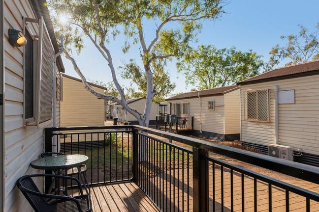 Discovery Parks - Pilbara Karratha is located in Karratha, Australia, close to attractions like Yaburara Heritage Trail Lookout. The property features various accommodation options, including powered and unpowered camping sites and cabins. The cabins are comfortably furnished and equipped with modern amenities, including air conditioning, tea and coffee-making facilities, and a private bathroom. Additional facilities include a swimming pool, barbecue facilities, a camp kitchen, and a playground.