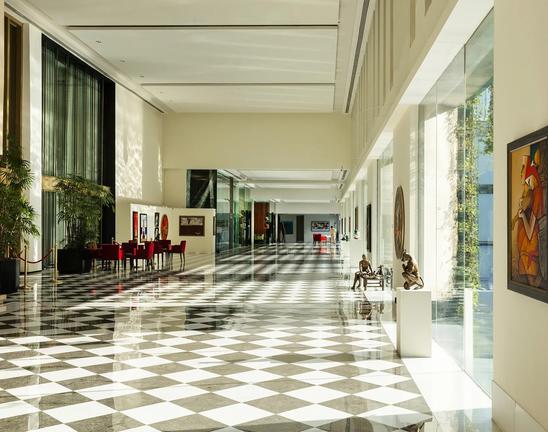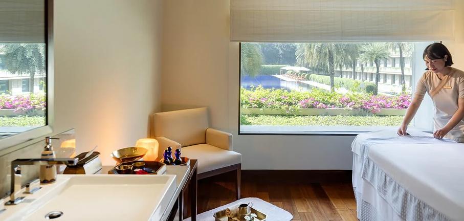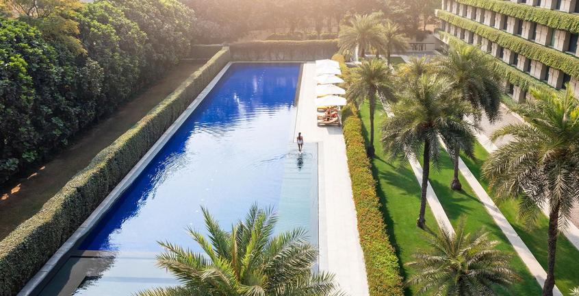 Where shimmering blue water meets lush green landscapes, The Oberoi, Gurgaon, is an urban sanctuary located in Haryana, India. The five-star property's rooms, suites, and residential suites come equipped with air conditioning, electronic safes, Wi-Fi, telephones, and TVs. Dining options comprise two restaurants serving Chinese and Indian cuisine. A food delivery service is available. Leisure facilities include two bars, swimming pools, a spa, and a fitness centre.