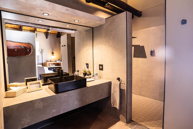 The four standard suites include a double bedroom, bathroom with shower, and a lounge with sofa to accommodate up to two adults. The private veranda is accessed through the screen doors and gives a spectacular view of the Waterberg Plateau.