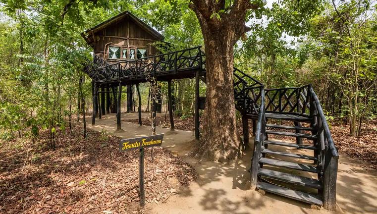 Tree House Hideaway is an intimate, luxury wilderness retreat spread across 21 acres of dense jungle in Bandhavgarh National Park, featuring a small collection of exquisitely crafted tree houses perched in the forest canopy for complete privacy and an immersive connection with nature. Each spacious, air‑conditioned tree house offers elegant, jungle‑inspired interiors, comfortable beds, attached bathrooms, mosquito netting and a balcony with forest views. Amenities include a multi‑cuisine restaurant and a bar encircling a century‑old mahua tree, with bush dining, guided jeep safaris, cycling and nature walks also on offer.