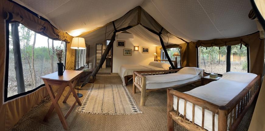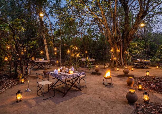 Jamtara Wilderness Camp is nestled in the heart of rural Pench, close to Pench National Park in Madhya Pradesh, India. This eco-friendly camp offers luxury tents designed to provide stunning views of the surrounding forest. Each tent features a permanent bathroom and a private patio for added comfort. For a more immersive experience, guests can also enjoy outdoor star beds, allowing them to sleep under the stars on an elevated platform.