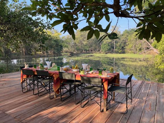 Shergarh Tented Camp is situated at the edge of the Kanha Tiger Reserve, set within 20 acres of regenerated woodlands. The camp features 8 spacious tents that are comfortably furnished and equipped with all the necessary amenities to ensure a comfortable stay, including air conditioning, a heater, a writing desk, a private veranda, and an en-suite bathroom. During their stay, guests can enjoy traditional Indian home-cooked meals at the on-site restaurant. Additional facilities include a bar and a library. Guests can relax on the big deck overlooking the water and take a refreshing dip during their stay.