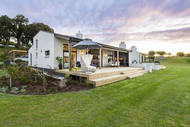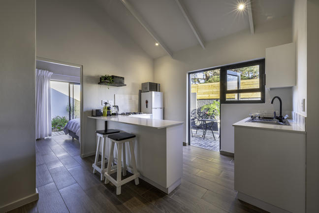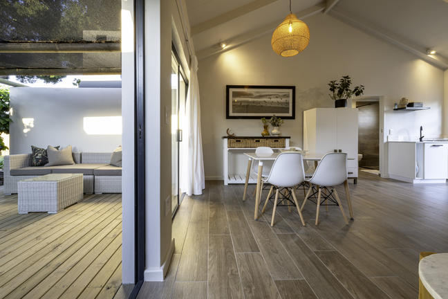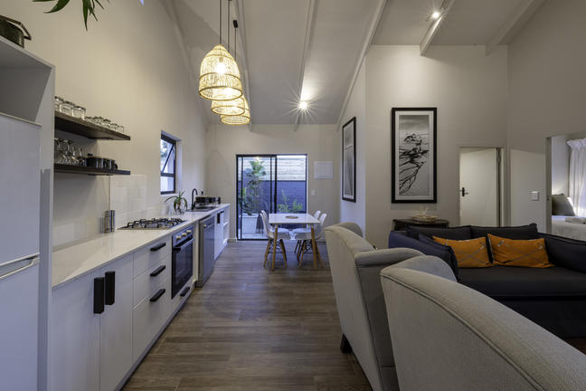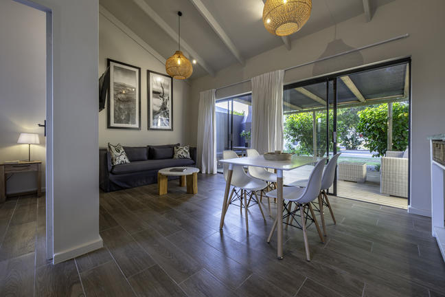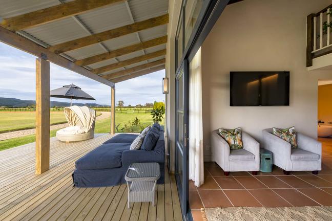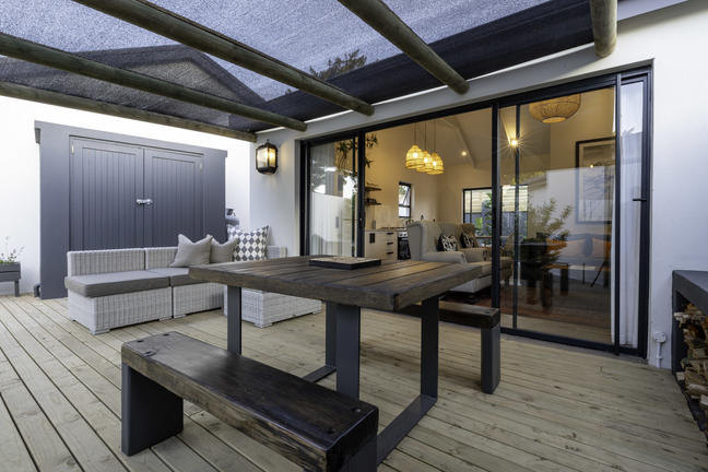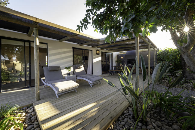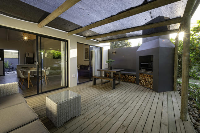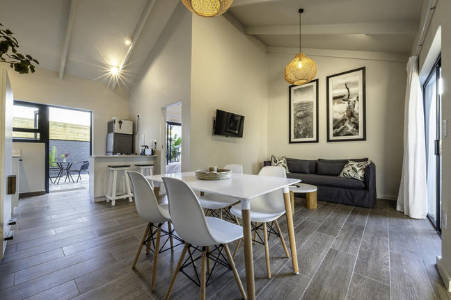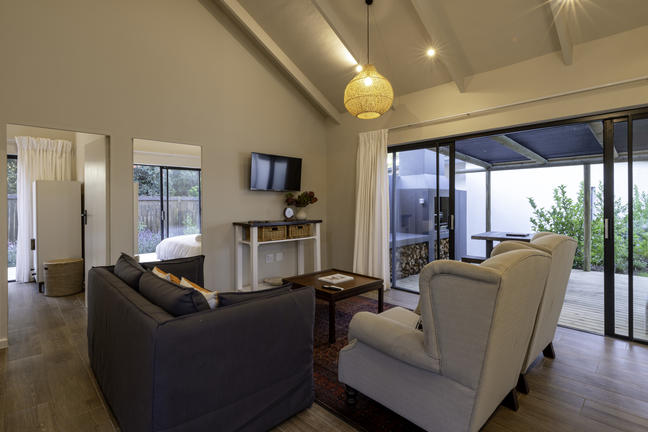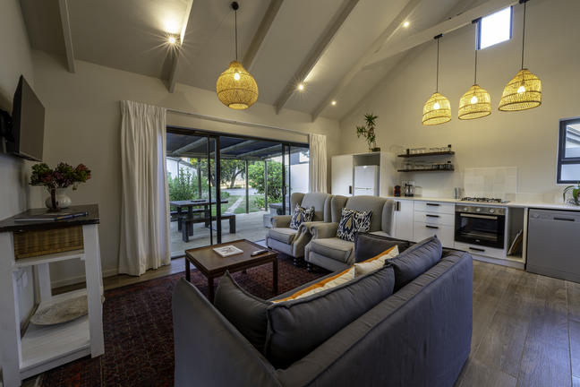 Modern, smakfullt möblerad stuga med öppen planlösning som leder ut till en täckt uteplats och däcksområde. Det finns två sovrum, ett med våningssäng, och båda har skjutdörrar som leder ut till däcksområdet.