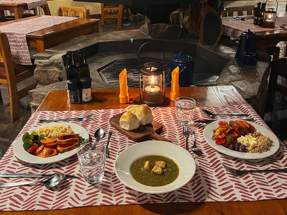 Three wholesome meals are served daily at table. Breakfast is "full English" style. Lunch consists of cold meats, cheese, salads, pickles, fresh vegetables and fruit. Dinner is a tasty warm meal cooked on open fire. At dinner, wine and beer are included.