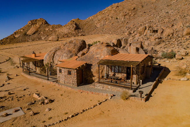 Ranch Koiimasis is situated in the heart of the Tiras Mountains, adjacent to the Namib Desert. The ranch offers a variety of accommodation options, including tastefully furnished chalets at the private Farm-Lodge "Fest Inn Fels," self-catering bungalows, and exclusive camping sites among granite boulders. Guests can enjoy dining at the on-site restaurant and Sky-Bar, which provide stunning views of the surrounding landscape. Nearby activities include guided tours through the desert savannah, Quiver tree forests, and cultural experiences with the local San community. For leisure, the ranch offers a swimming pool, horseback riding, and hiking trails.
