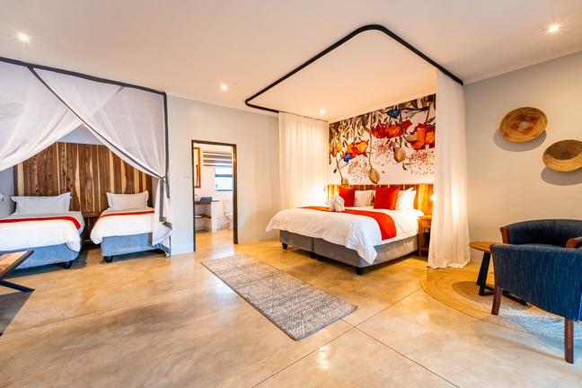 Our Family Room at Kabakwe Guest Lodge is thoughtfully designed to accommodate up to four guests, offering a comfortable and spacious retreat for families or small groups. Featuring a generous layout, the room includes a combination of a King bed and two single beds, a modern en-suite bathroom, air conditioning, complimentary Wi-Fi, and tea/coffee making facilities. Warm, welcoming décor inspired by the natural surroundings creates a relaxed atmosphere, while a private veranda invites guests to enjoy quiet moments overlooking a secluded section of our gardens. Perfect for families or friends travelling together, the Family Room ensures everyone can stay connected and comfortable while exploring the wonders of Victoria Falls.