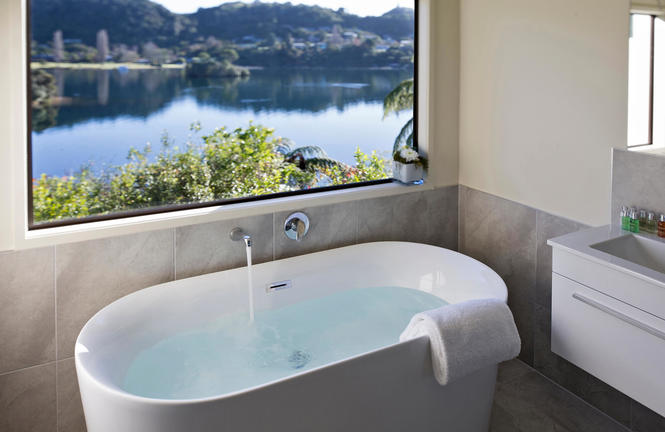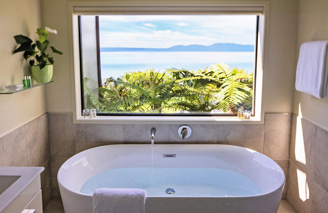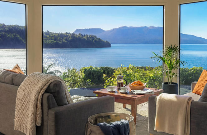 Styled with comfort in mind, all 9 luxurious suites feature panoramic views over Lake Tarawera’s still deep waters. Freestanding baths allow views over the lake while soaking. Complimentary mini bar, fruit and snacks are also at hand.