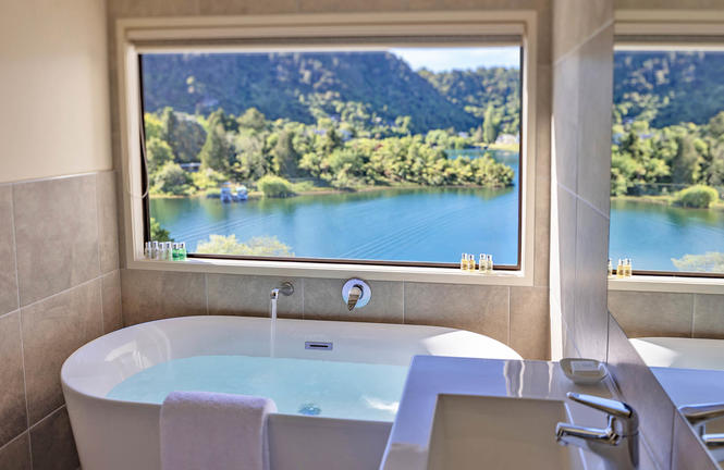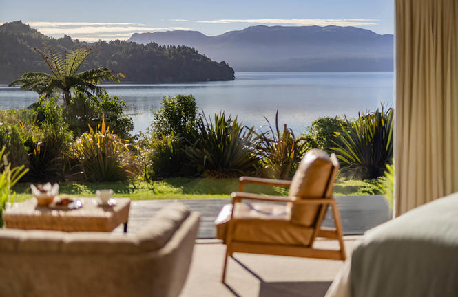 Solitaire Lodge, one of New Zealand’s premiere luxury lodges, enjoys breathtaking views over Lake Tarawera, with lush natural bush and volcanic landscape backdrop.