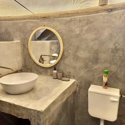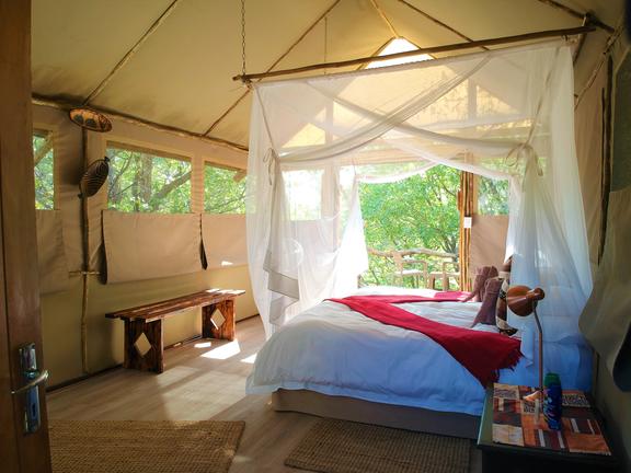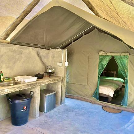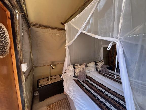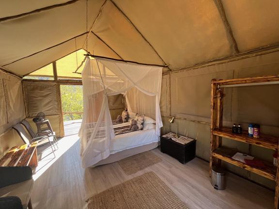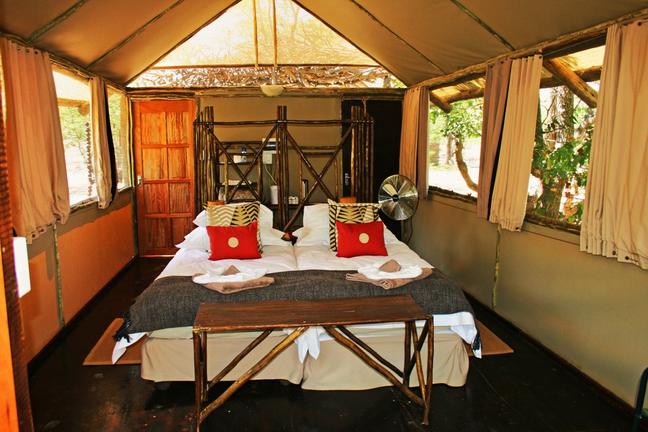 De grote observatieplatforms van de 6 luxe tenten op palen bieden een adembenemend uitzicht op het indrukwekkende Kalahari landschap met zijn rode duinen en kameeldoornbomen. De tenten zijn groot en comfortabel, smaakvol ingericht en beschikken over een eigen badkamer die bereikbaar is via een houten promenade. Elke tent is uitgerust met een koelkast.