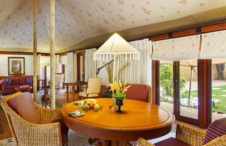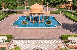 The Oberoi Rajvilas is a luxury resort located on Goner Road, just outside central Jaipur, Rajasthan. Nearby attractions include Amber Fort, Hawa Mahal, City Palace, Nahargarh Fort and Jaigarh Fort, all celebrated for their architectural grandeur. Guest rooms feature a four-poster bed, sunken marble bathtub, private garden or pool, walk-in wardrobe and elegant natural décor. Guests may dine at Surya Mahal for international cuisine, Raj Mahal for refined Indian dishes, or enjoy the Rajwada Library Bar. Facilities include a spa with traditional therapies, a temperature-controlled swimming pool, fitness centre, landscaped gardens and curated cultural experiences, ensuring a tranquil yet immersive stay.