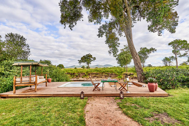 The Sambu Suite functions as a bush home intended for families or groups of friends. This 2-Bedroom Family Suite is purpose-built and designed for a couple who want space and seclusion or for parents who require their children under the same roof but with adequate space and privacy. It has two bedrooms under one roof and one swimming pool. Each bedroom has its own spacious en-suite bathroom, complete with an indoor and outdoor shower, "star bed" and sundowner viewing deck.