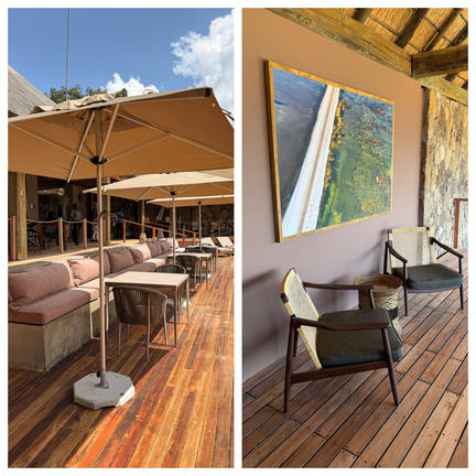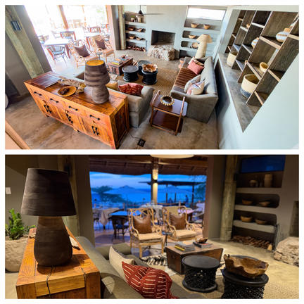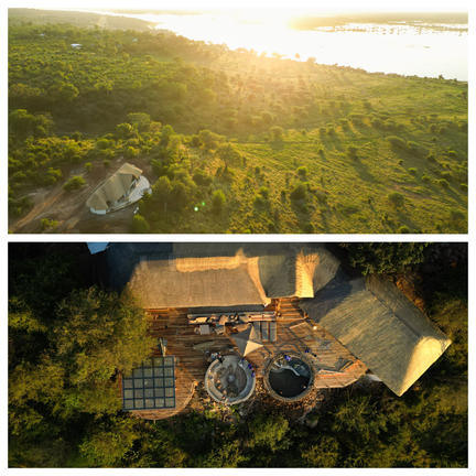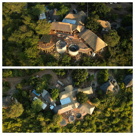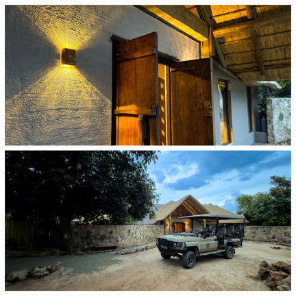 The lodge has been entirely constructed from sandbags, the thick sand-filled walls create a natural insulating barrier between the inhabitants and the harsh African climate and enhance the old farm-style feel of the camp. It houses sixteen rooms, two family rooms and can sleep 36 guests at a time.