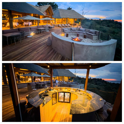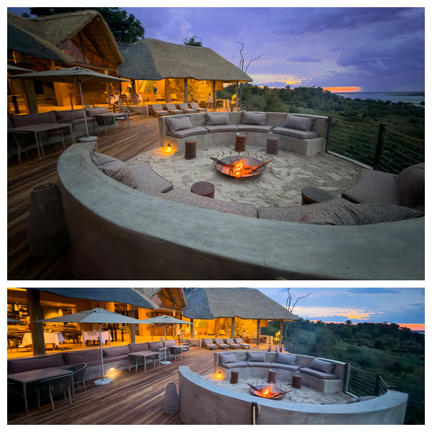 The heart of Camp Chitubu's communal life beats in the main entertainment area, encompassing a dining, bar, and lounge space, complemented by an inviting open-air fire pit.
