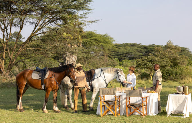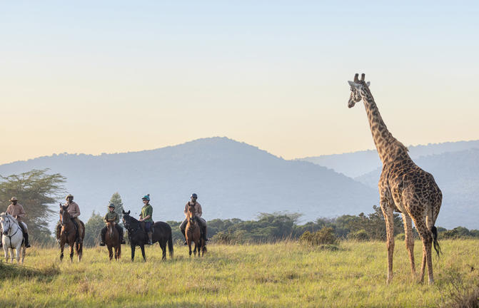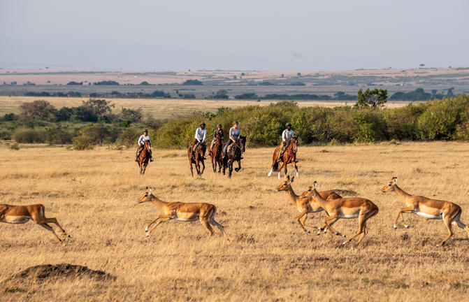 House in the Wild hat eine Herde von 16 gut erzogenen Pferden, die im Mara Training Center stationiert sind, eine 15-minütige Fahrt von der Lodge entfernt. Es wird eine Reihe von Ausritten für alle Fähigkeiten angeboten. Von einfachen Fahrten im Naretoi-Schutzgebiet, vorbei an Giraffen und Zebras, bis hin zu energischeren Galoppen durch das Enonkishu-Schutzgebiet — dies ist eine magische Art, den Geist der Wildnis zu erleben. Der frühe Morgen ist die beste Zeit, um die Tierwelt zu beobachten und vor der Hitze des Tages zu reiten, was in einem herrlichen Buschfrühstück gipfelt.