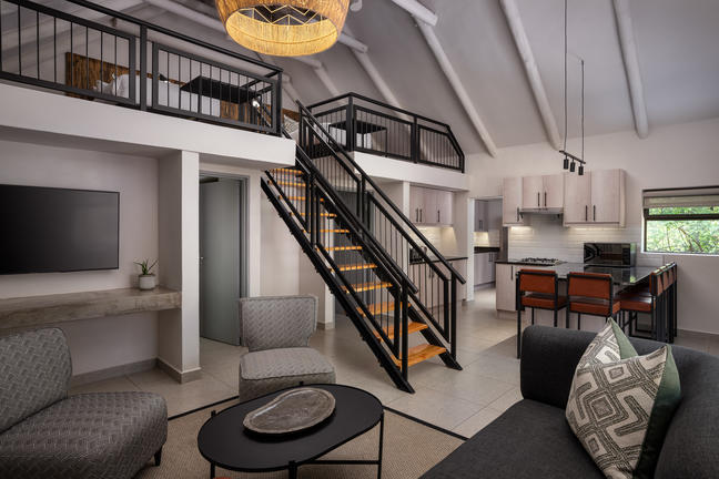 Die wunderschön eingerichteten Kruger-Chalets für Selbstversorger bieten Platz für sechs Personen in drei separaten Schlafzimmern mit hochwertiger Bettwäsche, darunter ein Hauptschlafzimmer mit einem Kingsize-Bett, ein Zweibettzimmer und ein charmantes Loft-Schlafzimmer, ebenfalls mit zwei Einzelbetten. Es gibt zwei Badezimmer mit Dusche und Badewanne.