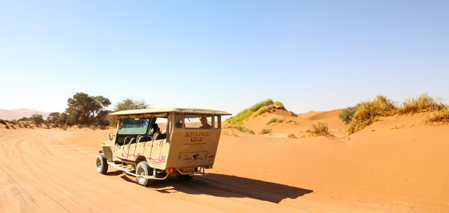 An early start from the Lodge to enter the Namib-Naukluft Park at sunrise, while the temperature is still mild and when the dune contrasts are at their best. You will travel in one of our all-terrain URI Gameviewer vehicles, custom-built in Namibia for the Lodge, with your own specially trained guide who will share all his knowledge of the area, animals, plant life and much more with you.