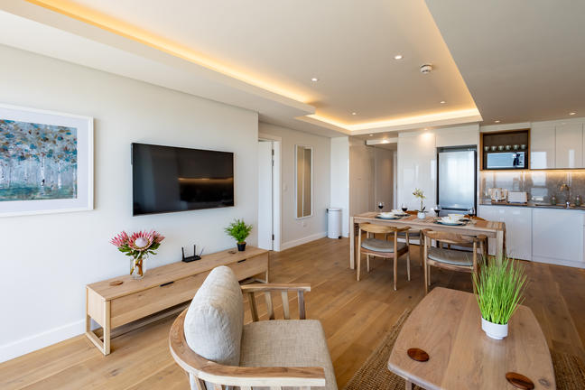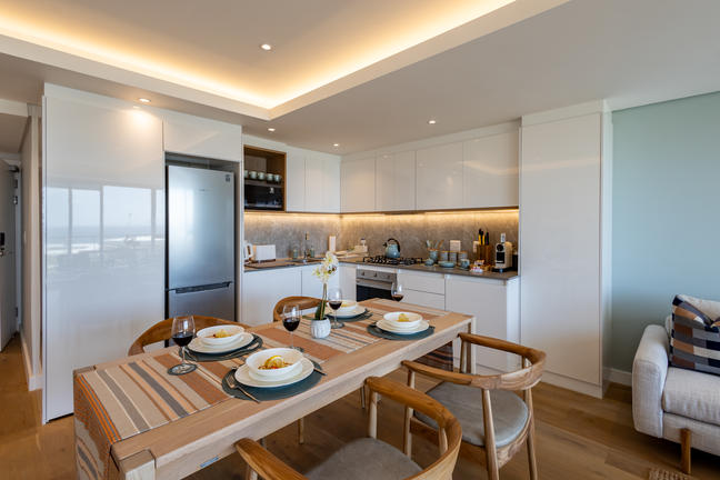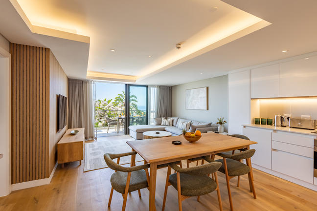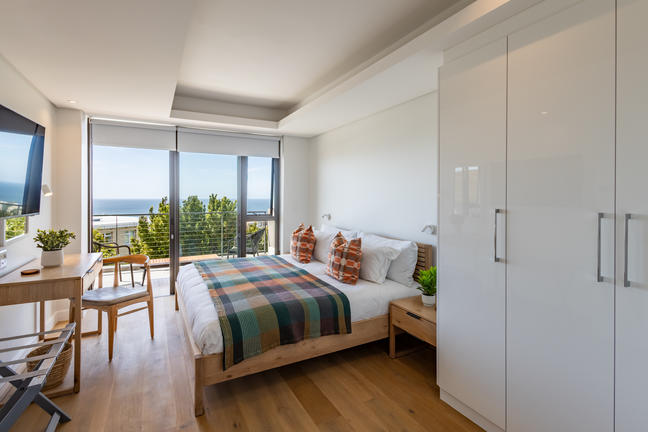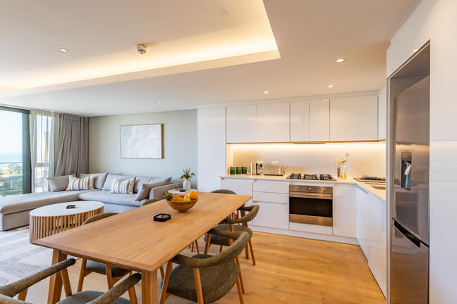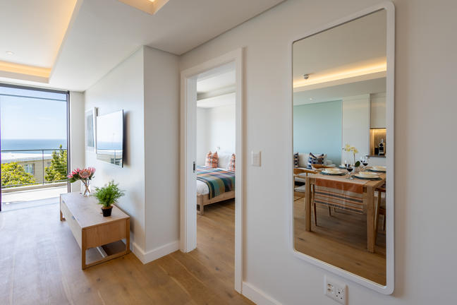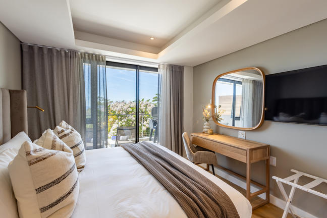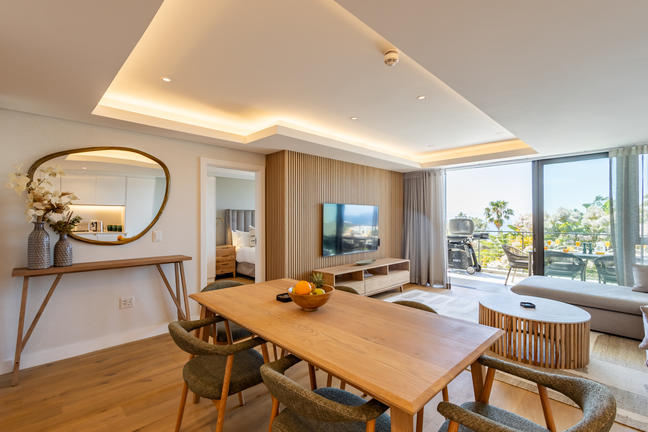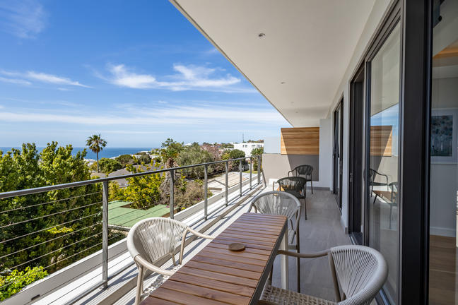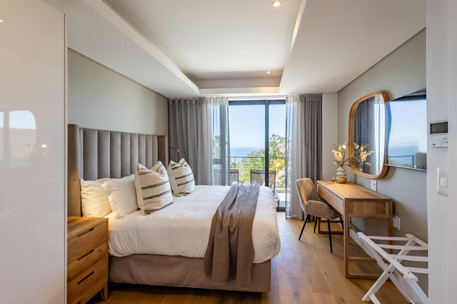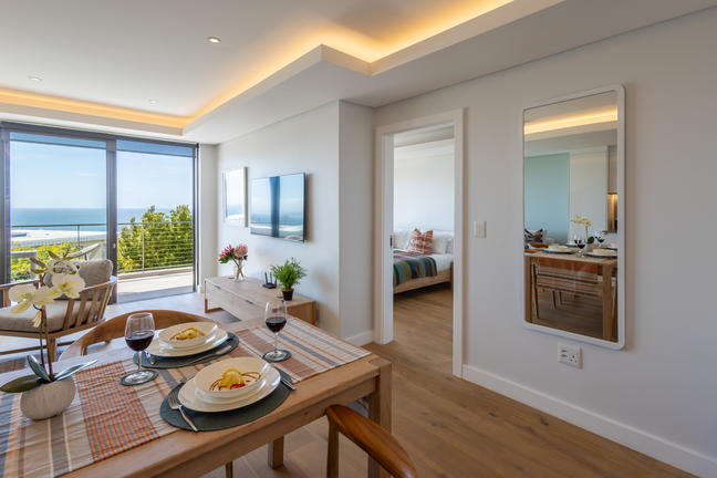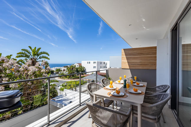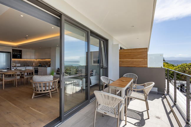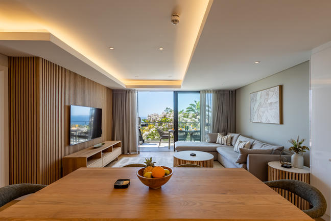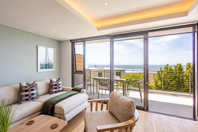 This stylish, open-plan apartment with a fully equipped kitchen and gas braai is perfect for self-catering and special family moments. With 3 welcoming and modern bedrooms, the main bedroom’s ensuite boasts a large bath while the other two ensuite bathrooms enjoy lovely showers. Savour stunning sea views from the gorgeous private balcony with outdoor dining, and year-round comfort with indoor climate control. Smart TVs are present in the lounge and main bedroom. Beds: 2× King, 1× Queen.
