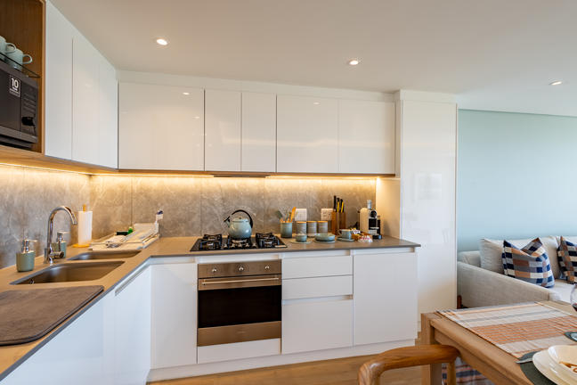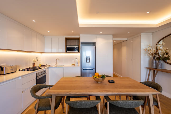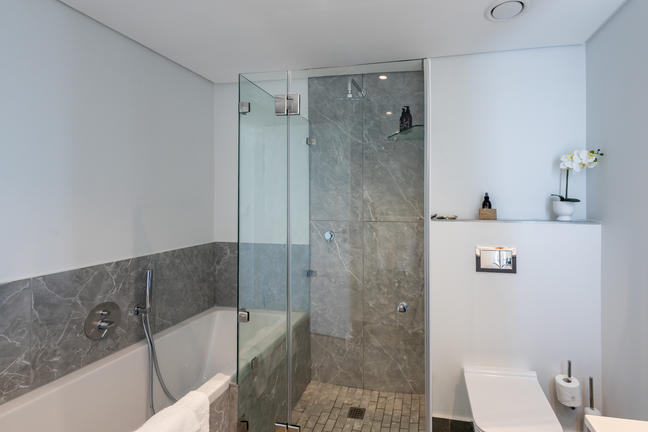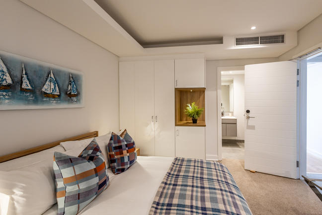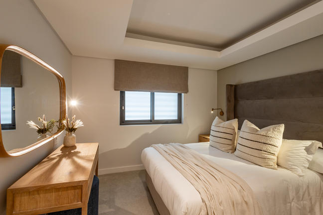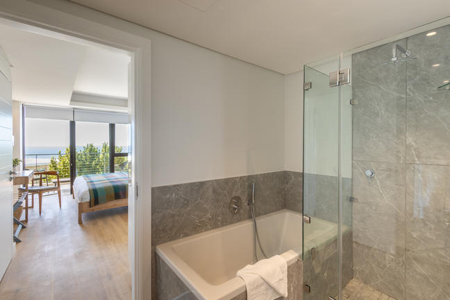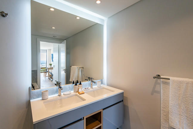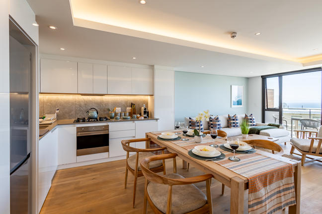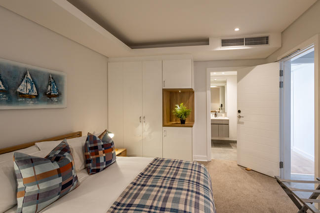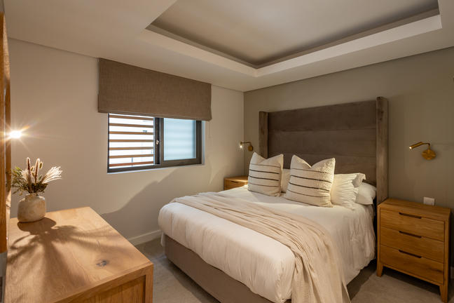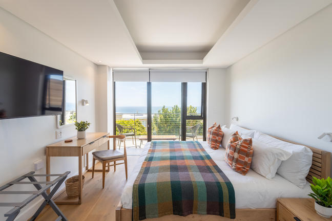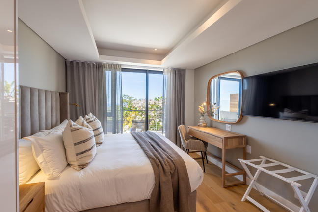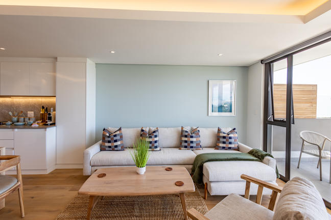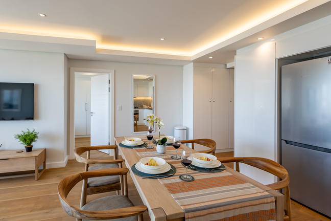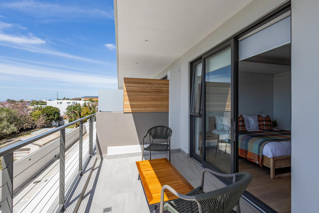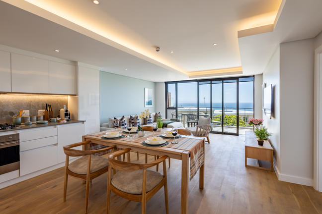 This stylish, open-plan apartment with a fully equipped kitchen and gas braai is perfect for self-catering and special family moments. With 3 welcoming and modern bedrooms, the main bedroom’s ensuite boasts a large bath while the other two ensuite bathrooms enjoy lovely showers. Savour stunning sea views from the gorgeous private balcony with outdoor dining, and year-round comfort with indoor climate control. Smart TVs are present in the lounge and main bedroom. Beds: 2× King, 1× Queen.