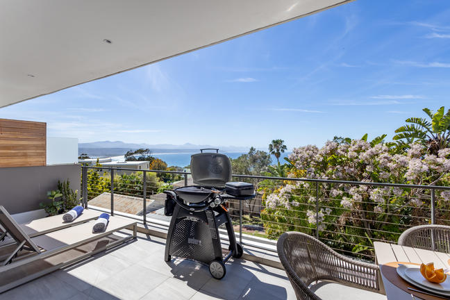 Perched on the top floor of Plett Quarter, this luxurious top-floor 3-bedroom apartment offers breathtaking views and elevated living. Each bedroom features an ensuite bathroom, with an additional guest toilet for convenience. The fully equipped kitchen includes a coffee machine, dishwasher, toaster, microwave, washer/dryer combo, and an ice machine. The main suite also features a bathtub for added relaxation. Outside, enjoy a private deck with a gas braai, your own pool and comfortable outdoor furniture. Hot and cold air conditioning ensures year-round comfort. Located on Main Street in Plett. Beds: 3× King.