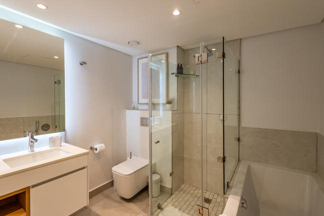 The elegant bathroom includes a walk-in shower, bathtub, double basins, and toilet, providing a spa-like experience. Guests staying in the Executive Room also enjoy complimentary access to the Executive Lounge, offering an exclusive space to unwind or work in style.