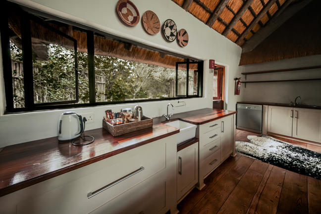 Stacking doors in the spacious lounge and dining area open onto a private deck at the edge of the lodge’s boundary. This modern safari home is thoughtfully designed to highlight the natural surroundings and offers stunning views of the bush and the Msunduze River. The Homestead is equipped with air conditioning and a refreshing plunge pool that overlooks the river.