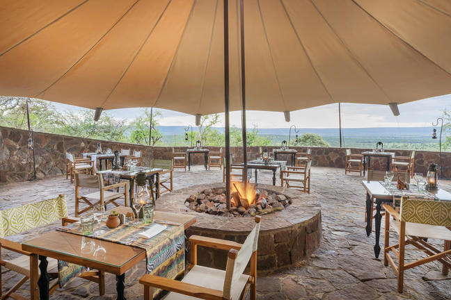 Le restaurant donne sur une magnifique terrasse offrant une vue imprenable sur le parc du Serengeti.