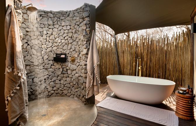 andBeyond Ngala Tented Camp comprises nine luxurious tented suites set on raised platforms, cleverly designed to blend into the riverside trees, minimising impact on the environment. A new layout and an extended outdoor deck ensure tents are even more spacious and luxurious, with the addition of secluded outdoor spaces to while away the afternoon. Ensuite bathrooms with a courtyard, boast double vanities, both an indoor and outdoor shower, and an al fresco bathtub. Tents are equipped with overhead fans, air conditioning, and electric blankets for winter. Private wooden decks offer quiet spots for contemplation or comfortable spaces to read a book. Discrete butler hatches, outdoor screens and well-positioned pathways add an extra element of tranquility and privacy. The overall essence of each tent is African, with warm, earthy tones used throughout and magnificent views over the riverbed.