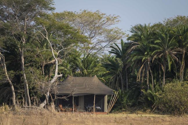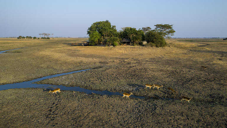 Aerial view of the Busanga Plains Camp.Credit: Mukambi SafarisThe camp is situated on a palm island amidst the many water streams.