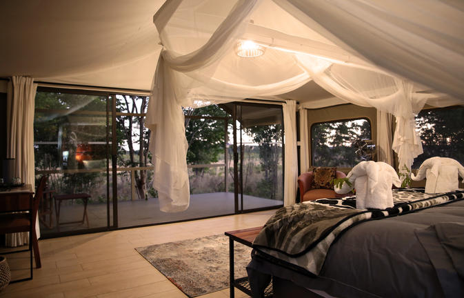 Le camp de tentes de Chamabondo offre le meilleur des deux mondes : une vue imprenable sur la faune depuis votre suite privée donnant sur un point d'eau paisible et la proximité des impressionnantes chutes Victoria, du puissant Zambèze et du centre-ville.