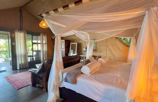 The rooms are tented safari suites on wooden decks above the water level and connected by walkways. Each has an en suite bathroom with open-air showers - solar-heated water - flushing toilets with natural waste water filtration and large private balconies.