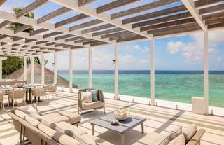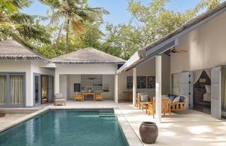 Between the two buildings lie the landscaped outdoor pool and terrace with its own beachfront sala, and the poolside living and dining area with daybed, sofa set, dining table and casual seating. And, of course, the private stretch of pristine beach leading onto the ocean completes the scene in unmistakeable Maldivian style.