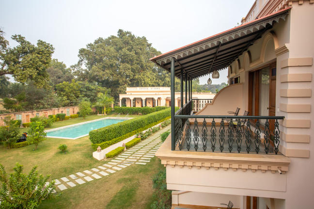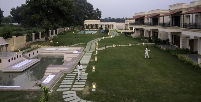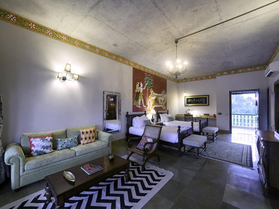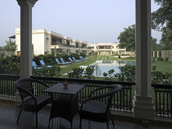 Coming back to the solace of your Resort, it offers Junior Suites, each with a private area of around 650 sq.ft. Done in a local style architecture, each Junior Suite allows the luxury of space and privacy. High ceiling, teak wood carved furniture, hand painted Shiva on the wall, a separate living area with comfortable sofa and a large flat screen television; very spacious and well-lit suite 150 sq.ft bathroom with a style so unique it would not have been seen elsewhere. And added to all of this, is a large private sit-out overlooking the gardens, the ‘kund’ (religious pond) and the open spaces around.