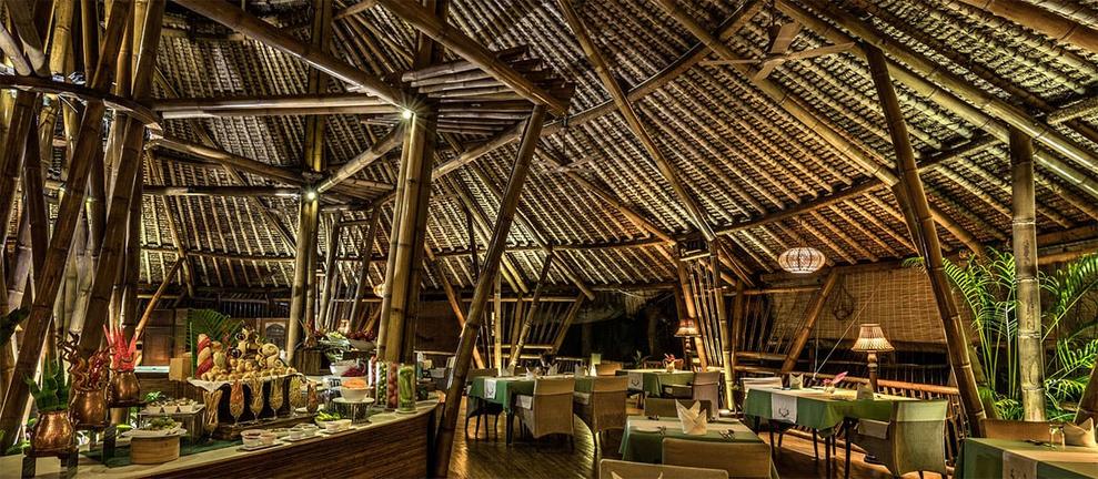 Accommodation options ranges from tree houses to cottages on stilts overlooking the stream and further downstream are cottages with Jacuzzis and private pools. A rope bridge across the stream, leads to the restaurant overlooking the swimming pool at one end and a sweeping view of the forest all around.