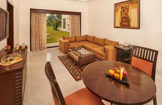 Spread over 550 square feet, the newly renovated hotel Suites at Trident, Agra feature an elegantly furnished bedroom and a living room, which are separated by sliding doors. The living room features an elegant dining area for 4 guests, making it perfect for an intimate evening of entertaining in privacy and style. Guests can also enjoy complimentary high speed internet. The soothing views of the gardens are best enjoyed from the comfortable sofas that are upholstered in warm tones and natural textures by the picture-frame window. The remodelled ensuite bathrooms, featuring Italian Botticino marble, have a bathtub and a shower.