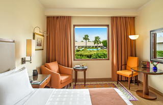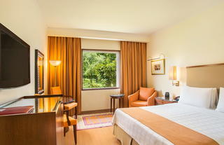 The LaLiT Temple View Khajuraho sits opposite the Circuit House in Khajuraho, just a short stroll from the Western Group of Temples. These UNESCO‑listed monuments, as well as the Lakshman Temple, lie within easy reach. Rooms are equipped with LCD TVs, minibars, and free Wi-Fi. Dining is available at an all‑day, multi‑cuisine restaurant called Panna, alongside the Mahua Bar, which offers light fare and cocktails in a serene setting by the pool. Guests may also enjoy wellness options, including a spa, outdoor swimming pool, and fitness centre.