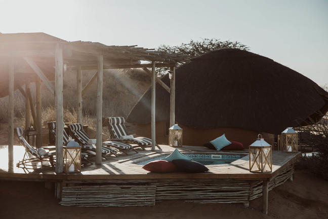 The Kalahari Red Dunes Lodge is situated in a vlei among the dunes on the western edge of the Kalahari, where the expansive Karoo desert meets the first red dunes of the Kalahari desert. This intimate lodge features uniquely and lovingly designed suites, each offering ample space and privacy. Guests are welcomed in a spacious reception building, and from there, a wooden walkway leads to the main building, which houses a restaurant with a cozy fireplace, a bar, an inviting lounge, and the "Kalahari Lounge" that boasts a fine selection of whiskey and hosts a billiard table. Additionally, there is a pool with a shaded area and comfortable loungers at the heart of the vlei.