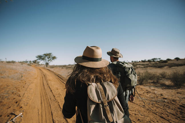 Dagwandeling met lunchpicknick – een vroege start biedt de mogelijkheid om onder het genot van een kopje koffie op de top van een duin de zon op te zien komen. De wandeling neemt je mee door de rode Kalahari-duinen die typisch zijn voor het gebied, afgewisseld met boomsavanne. In de middag kom je aan op het gezellige maar luxe duinkamp met uitzichtterras en zwembad. De chalets hebben een eigen badkamer en warme douche en schaduwrijke lapa, allemaal bovenop een duin. Hier wordt de braai geserveerd en wordt de nacht doorgebracht.