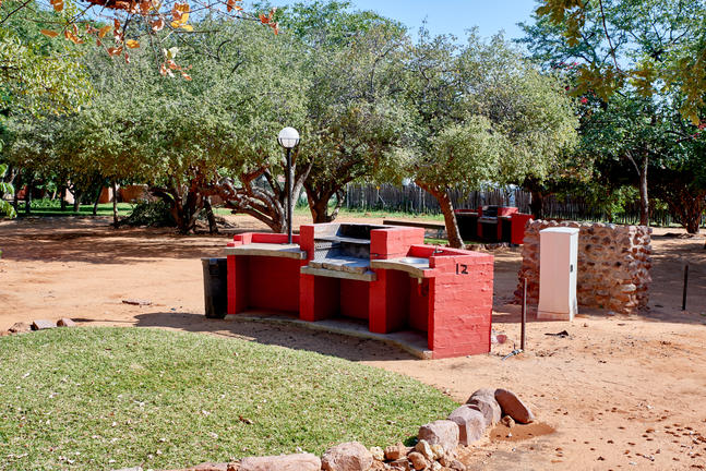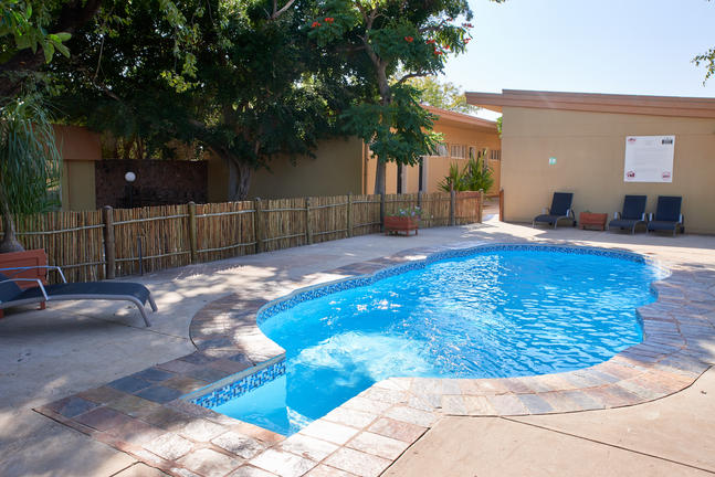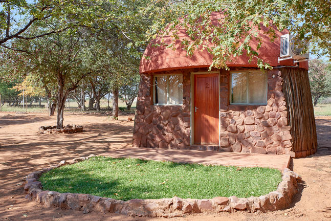Gelegen in einem märchenhaften Tal des Wasserbergs: Riesige Bäume, mächtiger Bambus und eine Quelle machen die Lodge im Bauernhausstil zu einer Oase am Rande der Kalahari. Es gibt zwei Pools, ein Gartencafé und ein Restaurant mit Bar. Zum Abendessen werden europäische Gerichte aus der typisch namibischen Bauernküche serviert (Menü).