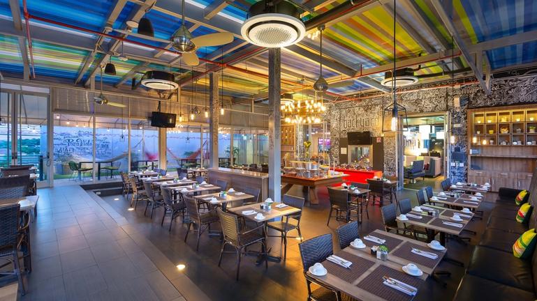 .An elegant outdoor/ indoor sea-view restaurant overlooking the hotel's lush gardens and pool area. A