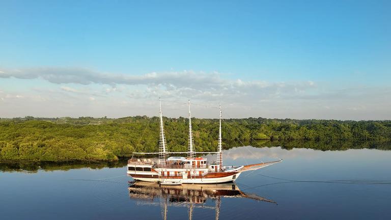 MV Desafio is a sailing ship offering intimate Amazon River expeditions from Manaus, Brazil. The ship offers accommodations in air-conditioned cabins featuring private bathrooms, wardrobes, and twin or double bed configurations for comfort. Guests can savour freshly prepared regional and international cuisine in the panoramic restaurant and bar, as well as access to a fully equipped kitchen for self-catering. Beyond the cabins and dining, the vessel provides a spacious sundeck with an outdoor bar, professional jungle guides for excursions, and modern safety equipment, blending heritage charm with contemporary amenities for an immersive Amazon experience.