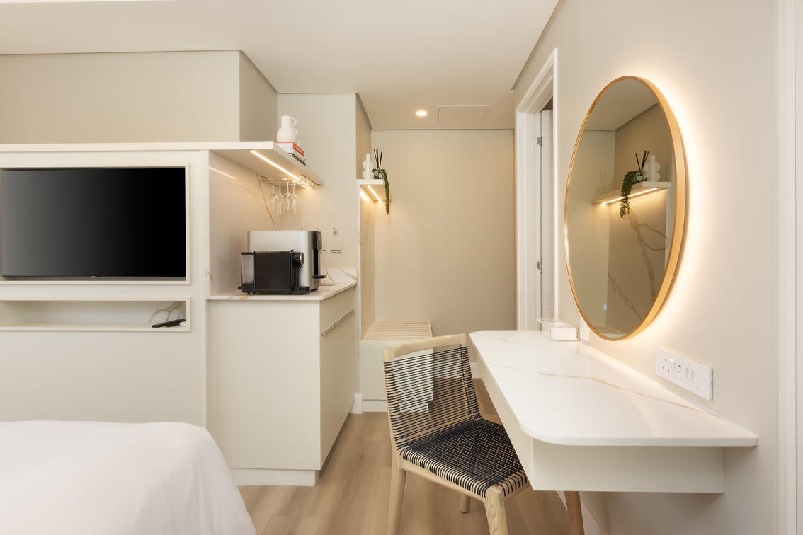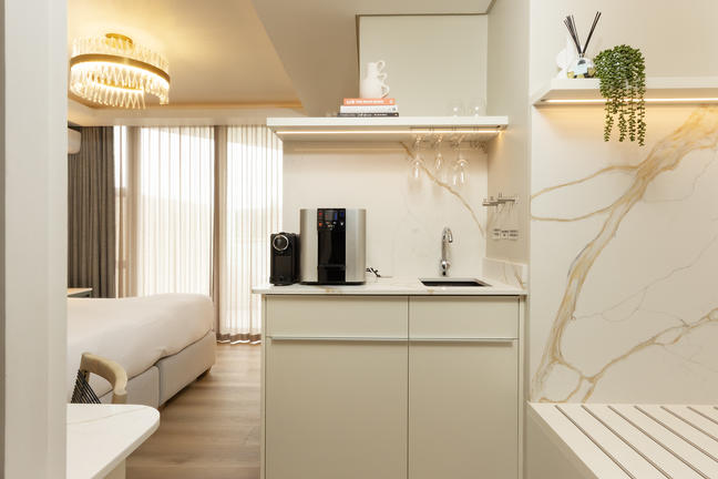 The 4 Deluxe Suites at Intle Boutique Hotel are beautifully decorated with stylish finishes. Perfect for couples or single travellers, these suites are 22m² in size and feature a king-size bed, a work desk, a cosy reading corner, and a private balcony. Each Deluxe Suite sleeps 2 adults and has a modern bathroom with a walk-in shower and double vanity.