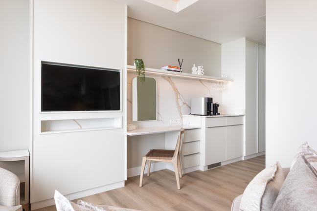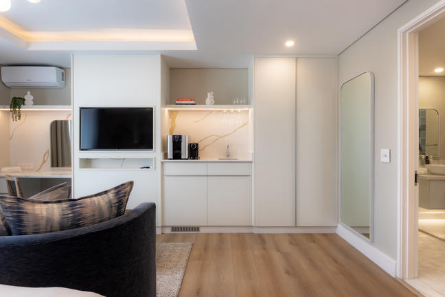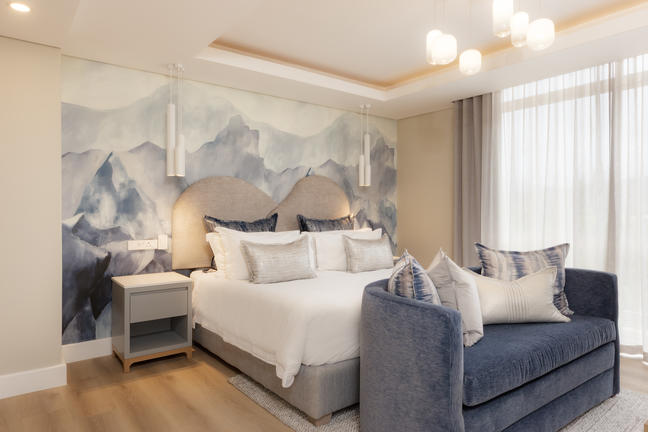 The spacious ensuite bathroom has double basins, underfloor heating, and heated towel rails. A private smart toilet includes a cleansing bidet and wash functions. A Smart TV with selected DSTV channels and Netflix, air-conditioning, mood-control lighting, unlimited Wi-Fi, a laptop mini-safe. A BIBO bar provides hot and chilled water filtration and purification, tea- and coffee-making facilities, and mini-bar.